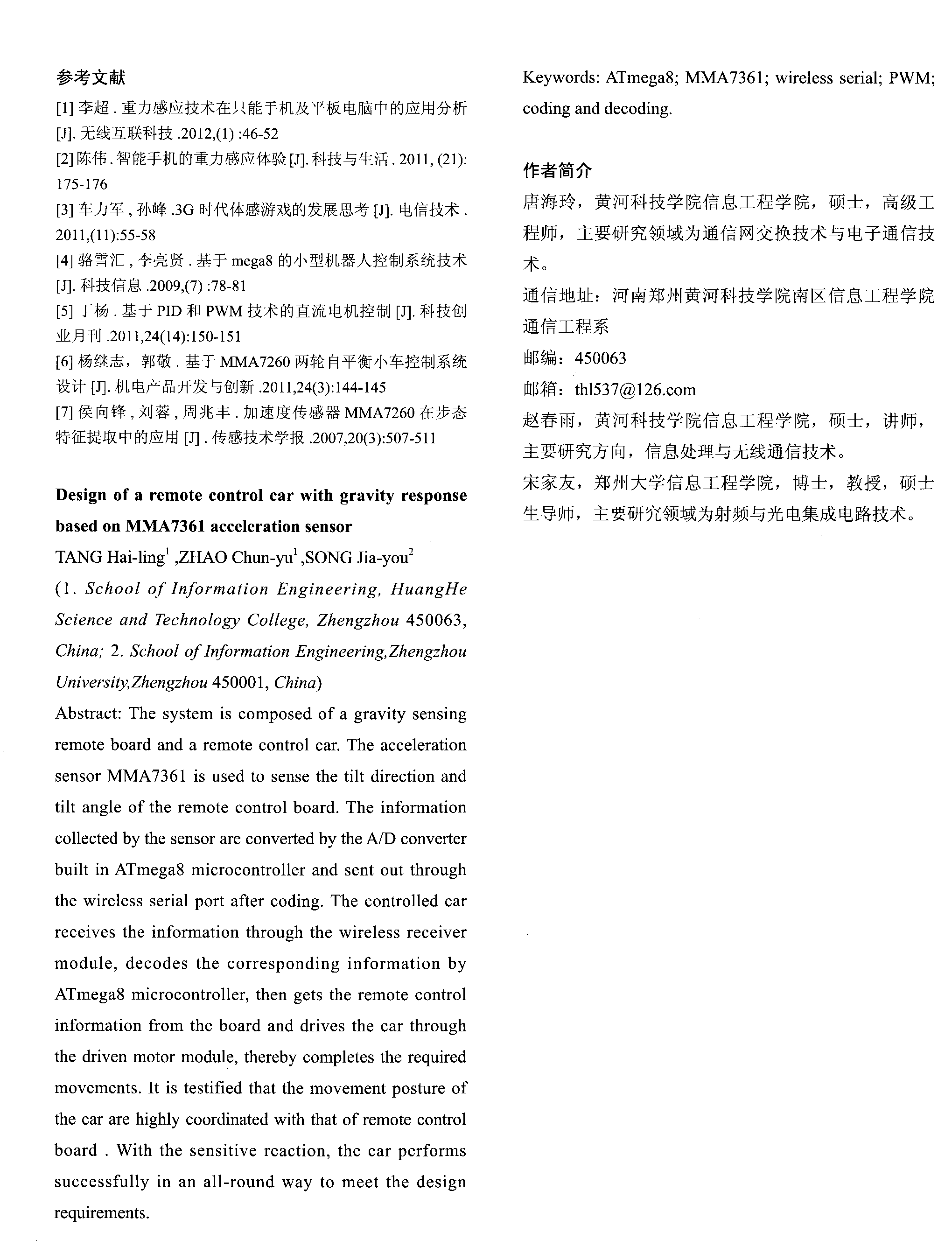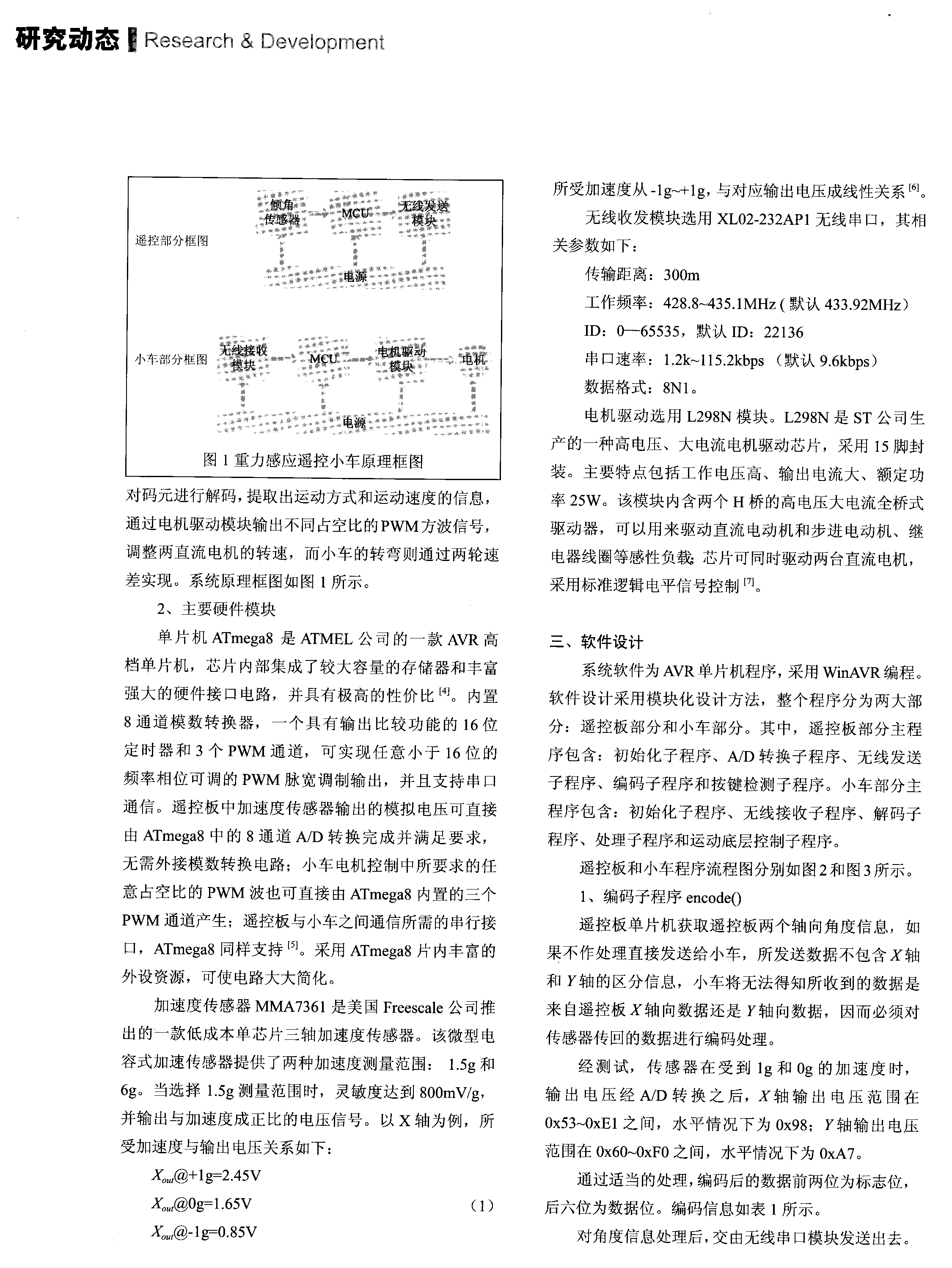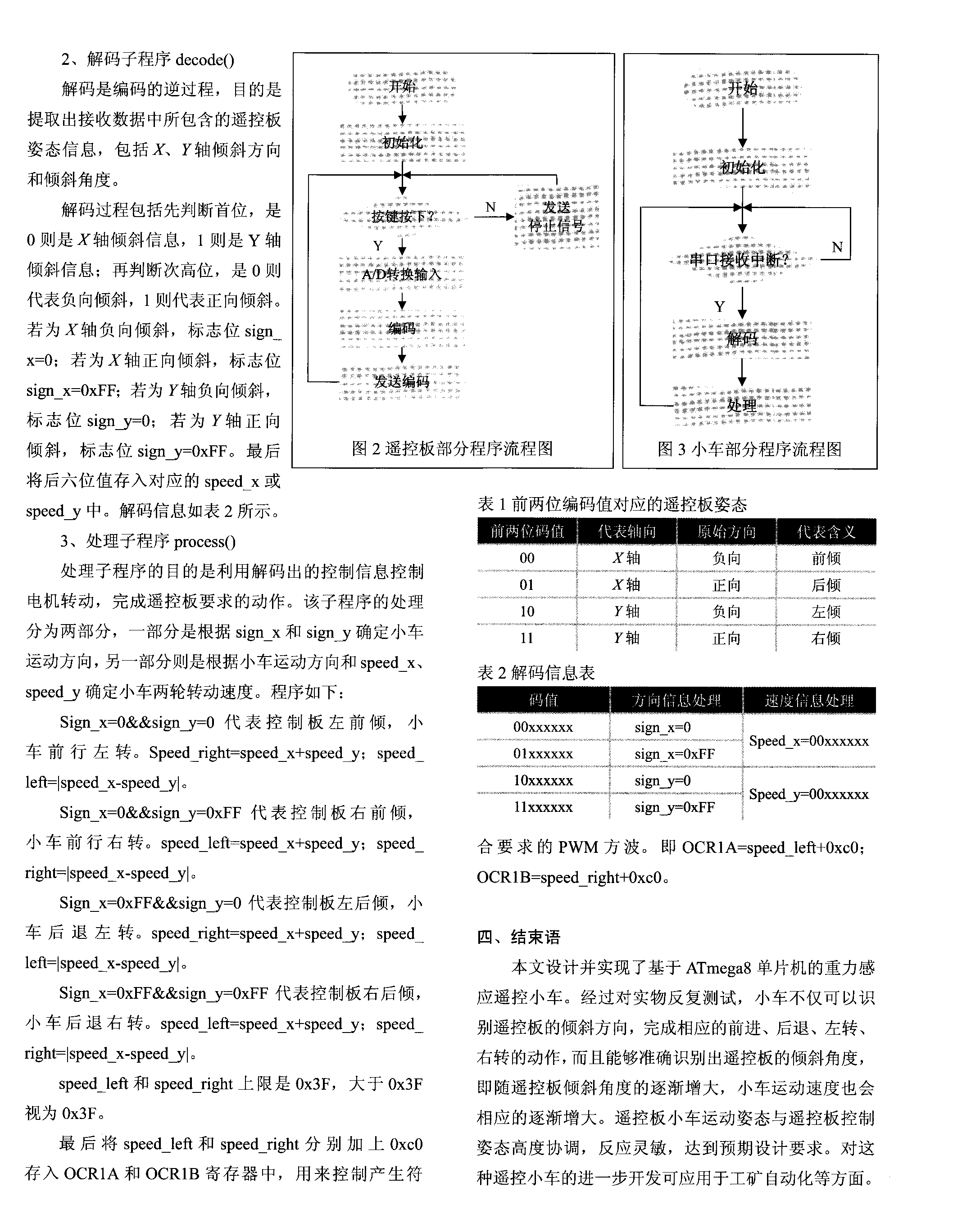 | 以下是引用片段: 一、引言 力感應(yīng)是指對(duì)地球重力方向的感知。重力感應(yīng) 技術(shù)的應(yīng)用領(lǐng)域非常廣泛,涉及工業(yè)自動(dòng)化、 機(jī)器人、軍工、航空、航天、機(jī)械、石油勘探、冶金、 化工、水利電力、煤炭系統(tǒng)、建筑工程、工程機(jī)械、 汽車工業(yè)等行業(yè)⑴。重力感應(yīng)作為近幾年興起的一種 新型控制方式,有著非常廣闊的應(yīng)用前景[2]。相比于 傳統(tǒng)的搖桿按鍵控制,重力感應(yīng)遙控器件與控制者的 身體姿態(tài)聯(lián)系更為緊密,所以更為簡(jiǎn)便直觀,且沒有 搖桿按鍵等操縱過程中的機(jī)械磨損,使用壽命更長(zhǎng)m。 本文給出了重力感應(yīng)遙控小車的設(shè)計(jì)實(shí)現(xiàn)方法。 它以重力感應(yīng)技術(shù)作為控制思想,由遙控板和被控小 車兩部分構(gòu)成。小車可隨遙控板姿態(tài)的前傾、后傾、 左傾和右傾,相應(yīng)完成前進(jìn)、后退、左轉(zhuǎn)和右轉(zhuǎn)動(dòng)作。 經(jīng)實(shí)際制作和檢驗(yàn),小車運(yùn)動(dòng)姿態(tài)與遙控板控制姿態(tài) 高度協(xié)調(diào),反應(yīng)靈敏,滿足設(shè)計(jì)要求。 1、總體方案 采用MMA7361三軸高靈敏度加速度傳感器作為 遙控板的姿態(tài)傳感元件,ATnwga8單片機(jī)作為主控制 器,無線串口 XL02-2EAP1模塊作為無線發(fā)送設(shè)備, 使用9V電池作為電源,采用L7805穩(wěn)壓芯片將9V電 源轉(zhuǎn)化為5V直流穩(wěn)壓電源,為系統(tǒng)供電。加速度傳感器將姿態(tài)數(shù)據(jù)傳送給單片機(jī),由單片機(jī)進(jìn)行數(shù)據(jù)識(shí) 別,并完成編碼,然后將包含有傳感器姿態(tài)信息的碼 元由無線串口發(fā)送出去。此外,遙控板上還設(shè)置有停 車按鍵,以控制停車。 小車亦采用無線串口 XL02432AP1模塊作為無 線接收設(shè)備,ATmega8單片機(jī)作為主控制器,采用 L298N作為電機(jī)控制芯片,實(shí)現(xiàn)對(duì)直流電機(jī)的驅(qū)動(dòng)。 使用7.8V鋰電池作為電源,采用L7805穩(wěn)壓芯片將 7.8V電源轉(zhuǎn)化為5V直流穩(wěn)壓電源,為系統(tǒng)供電。無 線串口接收遙控板發(fā)來的數(shù)據(jù)后送給單片機(jī),單片機(jī) |