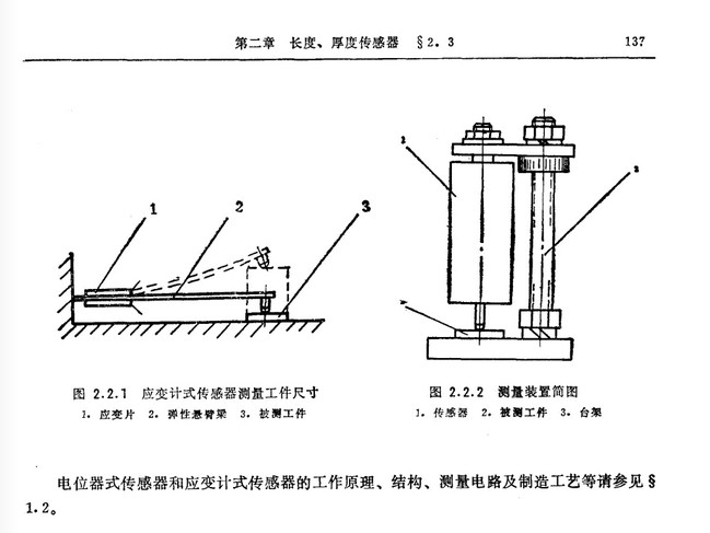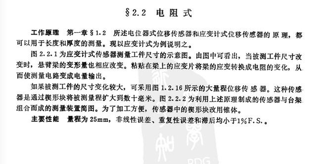 工作原理 圖2.2.1為應(yīng)變計(jì)式傳感器測(cè)量工件尺寸的示意圖。由圖中可看出,當(dāng)被測(cè)工件尺寸改變時(shí),懸臂梁的變形量也相應(yīng)改變。粘貼在梁上的應(yīng)變片將梁的應(yīng)變轉(zhuǎn)換成電阻的變化,從而使測(cè)量電路變成電量輸出。 如果被測(cè)工件的尺寸變化較大,可采用圖1.2.16所示的大量程位移傳感器。這種傳感器坫通過(guò)楔形塊將被測(cè)量程擴(kuò)大到數(shù)十毫米。圖2.2.2為利用上述原理制成的傳感器與臺(tái)架組合而而成的測(cè)量裝置簡(jiǎn)圖。為了加工方便,傳感器中的楔形塊改用錐體。 主要性能 量程為25mm,非線性誤差、重復(fù)性誤差和滯后均小于1%F.S.。 |