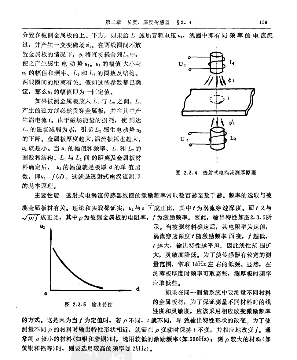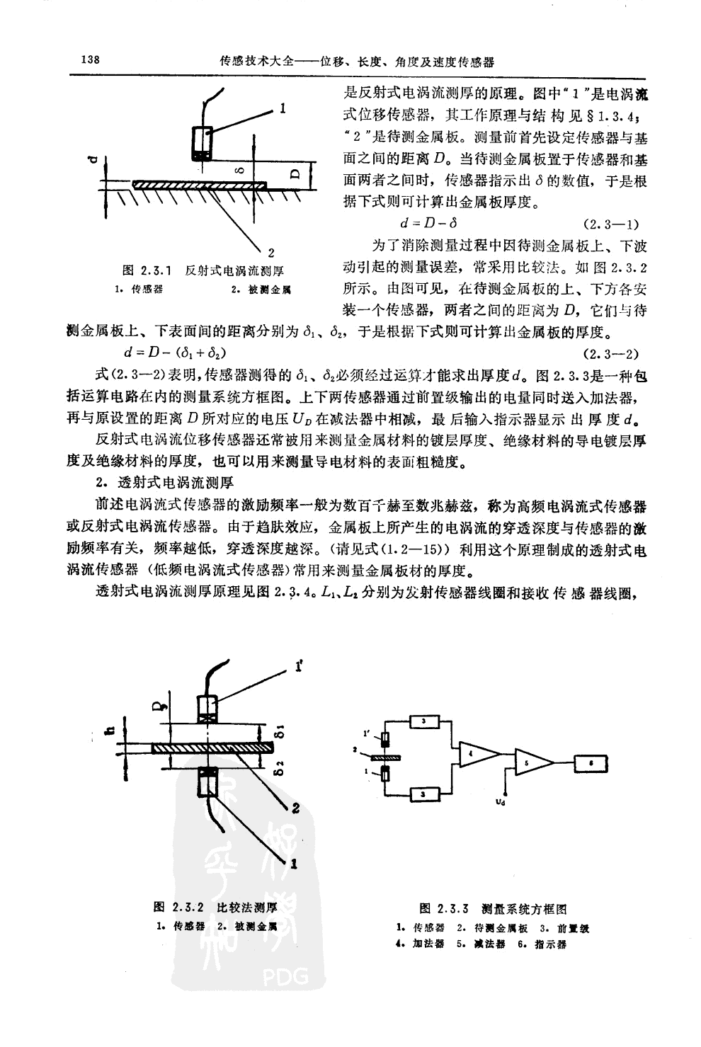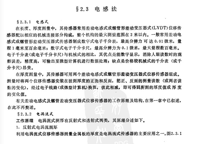 §2.3.1 屯感式 在長度、厚度測量中,其傳感器常用差動電感式或螺管形差動變壓器式(LVDT)位移傳感器配以相應的機械連接部分構成,整個機抅的max測量范圍在2米以內。一般常用差動電感式或螺管形差動變壓器式傳感器制成數字式電子千分表,max分辨力可達0.01微米,量程1毫米至百余毫米;數字式電子千分卡尺,max分辨力為0.1微米,max量程數百毫米。 電子千分表(或電子千分卡尺)與機械式的相比,其優點是能數字顯示,消除人眼讀數時的觀 察誤差,精度高,可輸出至微型計箅機進行數據處理;缺點是價格較機械式的千分表(或千 分卡尺)昂資。 在厚度測量中,其傳感器可用兩個差動電感式或螺管形差動變壓器式位移傳感器組成。 測量時將兩個位移傳感器安裝在被測厚度的正面和反面,把正、反面的測量讀數(或兩者讀數的變化),經過電子線路(或微型計箅機)換算,彼此相減,即可得到所測的厚度值或厚度 的變化值。 有關差動電感式及螺管差動變壓器式位移傳感器的工作原理及結構,在第一章中已敘述, 在此不再贅述。 §2.3.2 電渦流式 工作原理 電渦流式測厚有反射式和透射式兩類,其原理分述如下。 1.反射式電渦流測厚 利用電渦流式位移傳感器測量金屬板的厚度是電渦流式傳感器的主要應用之一。圖2.3.1 |