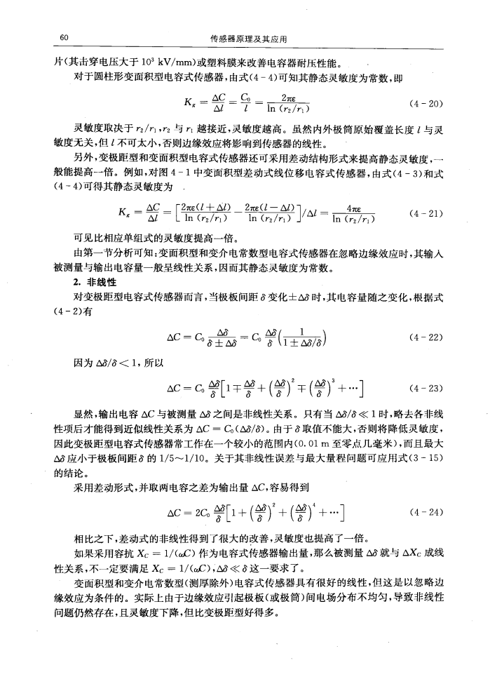 | 文摘: 變面積M和變介電常數型(測抒除外)電容式傳感器具有很好的線性,仍 這是以忽略邊 緣效應為條件的。實際上由于邊緣效應引起極板(或極筒) 間電場分布不均勻,導致非線性 問題仍然存在,且靈敏度下降,但比變極 距型好得多。 |