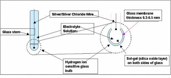 · 特殊成分的玻璃感測氫離子(H+)和生成 一個毫伏電壓(25° C時,59.2 mV / pH單位).