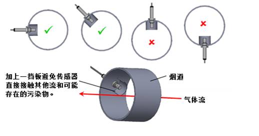 在高濕度抑或有水滴的這種環境下,應該保護傳感器避免水直接接觸或滴落到傳感器的高溫外帽上,因為這樣會對傳感器的密封室和加熱器造成巨大的溫度沖擊。典型的做法是用一個透氣好的兜帽罩住傳感器的外帽或者把傳感器安裝在一個更大直徑的氣缸中。至少傳感器應該傾斜地朝下安裝在應用設備中,因為這樣子放置可以使得傳感器擺脫掉一些水汽并且不被滴落到水滴。
