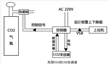 接下來讓我們來看一個典型的CO2室內控制系統的方案。本方案適用于室內植物養殖、魚池CO2供給等項目,可以利用GSS品牌的CO2傳感器實時檢測CO2濃度值,并通過CO2變送器把數據傳送給系統中相關的控制模塊輔助該控制模塊對CO2濃度值進行有效的流量控制,同時使用上位機還可調節CO2的報警值。