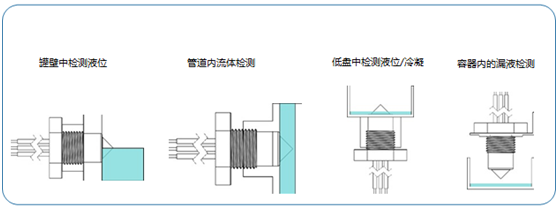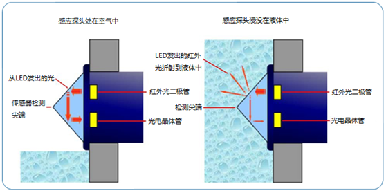 當液位開關的感應探頭裸露在空氣中,紅外光會在探頭尖端內反射回光電晶體管,從而在紅外光二極管與光電晶體管之間形成強力的光耦合。當感應探頭浸沒在液體中,紅外光會從探頭尖端內折射出去,造成在光電晶體管這端接受到的光量有所減少,因此觸發輸出狀態的改變。