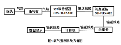 以下圖1描述了一個典型的采用SST氧化鋯探頭和變送板做成的氧氣監(jiān)測系統(tǒng)。其中,氣體采集系統(tǒng)由探頭、抽氣泵和氣路組成,氣體檢測部分則由氧化鋯傳感器和變送板組成。當抽出的氣體流經(jīng)氧氣傳感器時,產(chǎn)生的電信號經(jīng)變送器產(chǎn)生氧氣濃度的數(shù)字信號,實時通過輸送線路至采集卡再經(jīng)計算機采集存儲,同時也可以在顯示器上顯示或儲存打印。