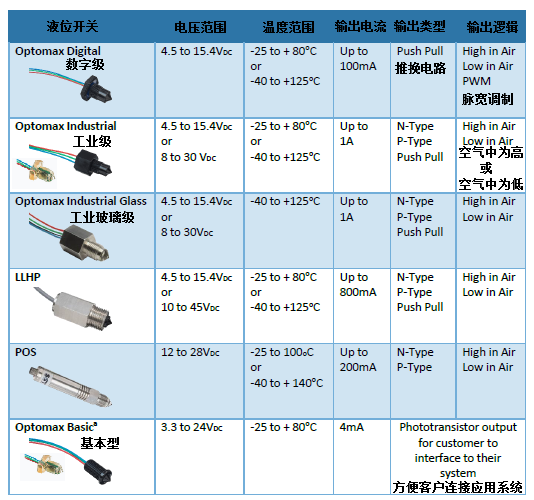 如上圖展示,在液位傳感器頂端內(nèi)的光學感應頭上裝有LED發(fā)射器和光電晶體管。當無液體存在時,LED發(fā)出的光全部在里面反射回光電管;當液體漫過傳感器頂端時,部分光線會透射到液體里,因此光電管接收到的光強減少,造成傳感器輸出狀態(tài)改變。采用這種方法檢測液位非常靈敏,且無需使用運動部件。常用型號LLC200D3和LLC710D3-003以及LLC210D3-001等。下圖為各材質(zhì)各型號的技術(shù)規(guī)格表,僅提供客戶參考。