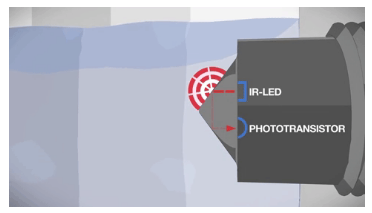 后說到光電液位開關,它的主要組件是一個由耐磨聚合物或玻璃材質(zhì)做成的探頭,其中集成有紅外(IR)光源和光學探測器。當探頭處在空氣中,紅外光線反射到傳感器尖端的內(nèi)部,不產(chǎn)生外射,全部光信號都可以反射到光學探測器。相反,當浸入液體中時,這種紅外光將從尖端折射出去進入待測液體,導致折回光信號減弱,zui終光學探測器這端接收到的光信號降低。