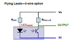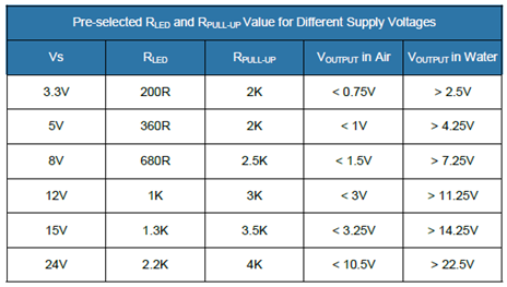 如右上圖,RLED是限流電阻,作用是限制電流以免燒壞光電液位開關內部的光電二極管,RPULL-UP是上拉電阻,保證產品探頭在未接觸到任何液體時,綠線上的輸出恒為高電平,只有當光電開關導通,即檢測到液體存在,或者說探頭接觸到了水時,輸出電平才會有明顯的改變,從高變低,反之亦然。
