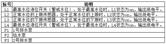 (1)正常水位時:L3、L4狀態為On,輸出低電平,L1和L2狀態為Off,輸出高電平,P1、P2和P3狀態為關閉,給水泵和排水泵都不工作。