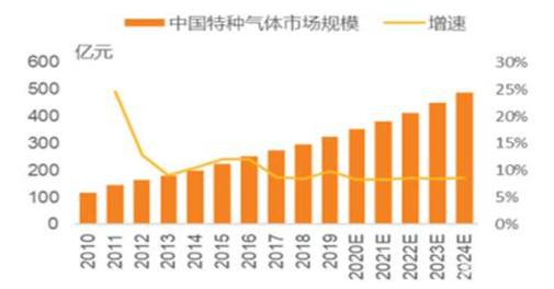 隨著工業氣體在更多領域的廣泛運用,市場前景十分廣闊。預計,18-22年我國工業氣體市場CAGR為10.44%,到2022年有望達到近410億美元規模。