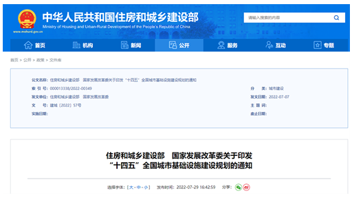 2022年7月29日,住房和城鄉建設部、國家發展改革委聯合發布《“十四五”全國城市基礎設施建設規劃》。