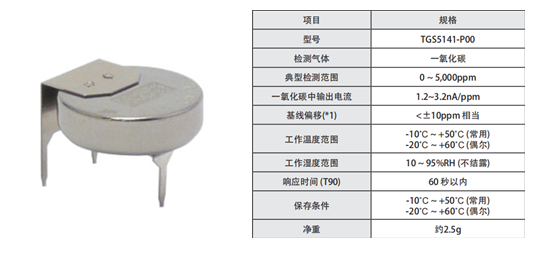 TGS5141是費加羅研發的可電池驅動的電化學式傳感器,使用一個特殊的電極取代了儲水器,由于去除了TGS5042中使用的儲水器,TGS5141與TGS5042相比,其外形尺寸縮減到只有后者的10%大小。壽命可達十年以上。非常合適用于家庭CO報警器。