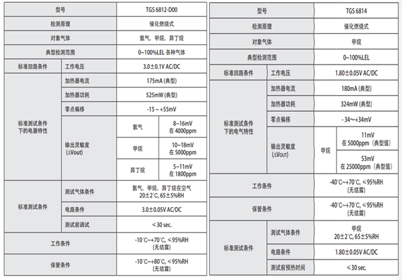 下面是兩個(gè)傳感器的具體規(guī)格,可以看到兩者加熱電壓不同,TGS6814相比TGS6812加熱功耗更小,零點(diǎn)漂移更小,輸出靈敏度更穩(wěn)定。