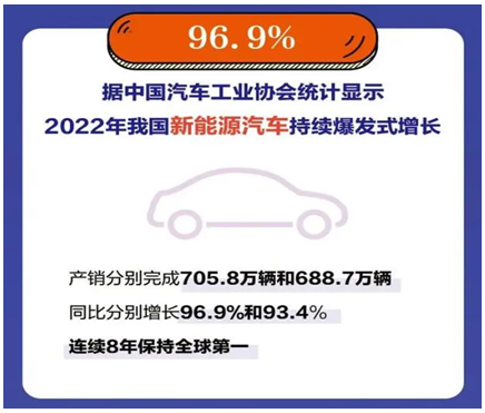 中汽協(xié)數(shù)據(jù)顯示,我國新能源汽車持續(xù)爆發(fā)式增長,2022全年產銷分別完成705.8萬輛和688.7萬輛,同比分別增長96.9%和93.4%,連續(xù)8年位居全球第一,且市場占有率提升至25.6%,高于上年121個百分點,逐步進入全面市場化拓展期,迎來新的發(fā)展和增長階段。新能源汽車新車銷量占汽車新車總銷量的25.6%,提前三年完成2025年規(guī)劃目標。由此可見我國新能源汽車的發(fā)展前景是相當好。