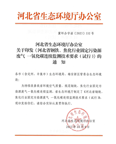 一氧化碳?xì)怏w是人們常見易燃?xì)怏w,在日常生活中,碳燃燒,煤炭燃燒,天然氣等都會產(chǎn)生一氧化碳,雖然一氧化碳是常見的氣體,但是并不是對人體有利的氣體,相反在濃度高的時候可能還會對人體的機能產(chǎn)生損壞,更甚至威脅生命健康。工業(yè)上對于一氧化碳的排放也有要求。2023年10月為持續(xù)改善環(huán)境空氣質(zhì)量,規(guī)范鋼鐵、焦化行業(yè)固定污染源廢氣一氧化碳連續(xù)監(jiān)測,河北省生態(tài)環(huán)境廳制定了《河北省鋼鐵、焦化行業(yè)固定污染源廢氣 一氧化碳連續(xù)監(jiān)測技術(shù)要求(試行)》,文件全文如下: