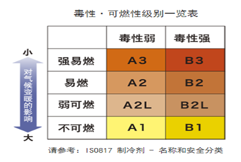 目前空調(diào)設(shè)備廣泛使用的制冷劑是化學(xué)性質(zhì)穩(wěn)定、不可燃(A1)的氟利昂,因此,即便是制冷劑泄露到空調(diào)設(shè)備外面,不必擔(dān)憂有起火等安全問題。然而,不可燃(AI)的氟利昂已經(jīng)明確是引起氣候變暖的溫室效應(yīng)氣體,氟利昂排放到大氣中也會導(dǎo)致臭氧含量下降。