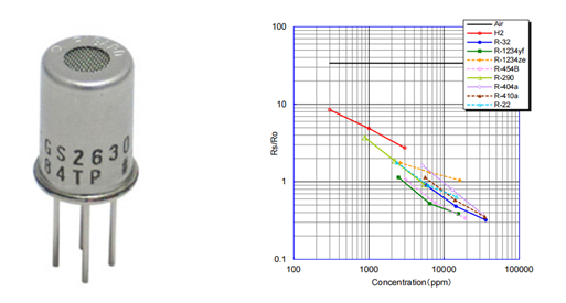 FIGARO為此研發(fā)了一款檢測新式冷媒的傳感器TGS2630。不僅對被廣泛應(yīng)用于檢測空調(diào)、冷凍設(shè)備最常使用的制冷劑R-404a、R-410a,對可降低GWP(全球氣候變暖指數(shù))的“弱可燃(A2L)制冷劑”R-32、R-1234yf以及“易燃(A3)制冷劑”R-290(主要成分為丙烷)等也有很高的靈敏度。