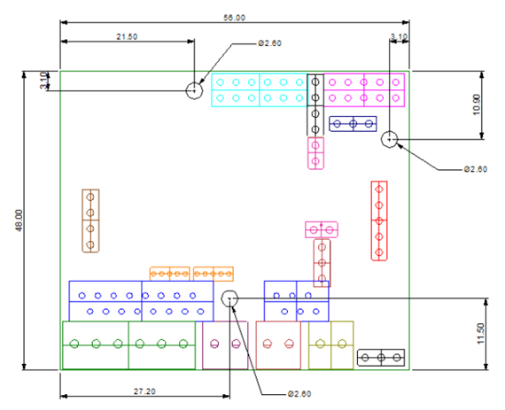 Novagas2變送板是所有NG2型號的通用板,寬56mm x 48mm。有三個孔(下圖中為黑色)來按客戶需求固定該板。