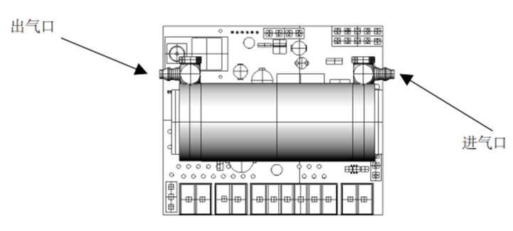 Novagas2傳感器有兩個管接頭。如果氣體在氣體單元內偏向某個方向流動,傳感器的測量性能則最佳。從頂部看Novagas2傳感器,WEIDMULLER(橙色)連接器位于底部,右方的管口是進氣口,左邊的則是出氣口。下圖顯示了進氣口/出氣口位置,參考氣體單元和橙色連接器方向,這兩個口的型號取決于Novagas2傳感器的型號。