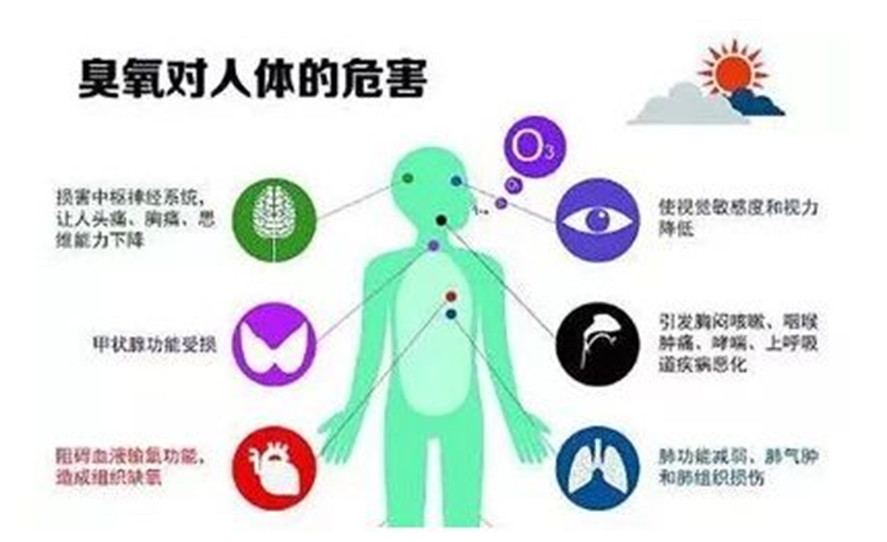 臭氧能到達呼吸道的深部,對呼吸器官有強烈的刺激作用,引起呼吸道的收縮。其刺激的程度勝于氮氧化物與二氧化硫,其對呼吸系統的毒性比氮氧化物大10倍以上。臭氧的嗅覺閾值很低,濃度達到0.02 ppm時,就能聞到臭味;達到0.1ppm時,呼吸2小時,將使肺活量減小20%,達到0.3ppm,對鼻、腦有刺激作用;超過1ppm時,眼、鼻、喉嚨發干,有燒灼感,頭痛,時間再長,中樞神經會發生障礙,思維還會紊亂;達到10ppm時,容易引起肺氣腫。此外,臭氧還能阻礙血液輸氧功能,造成組織缺氧;使甲狀腺功能受損、骨骼鈣化,還可引起潛在性的全身影響,如誘發淋巴細胞染色體畸變,損害某些酶的活性和產生溶血反應。大量實驗研究表明,暴露在臭氧濃度為0.16 mg/m3的空氣環境中,6.6小時,健康人群就會有不良影響的顯著體現;達到0.30 mg/m3時,即可引起咳嗽。我國研究人員的實驗也表明,臭氧濃度達到0.10~0.14 mg/m3時,人體的生理指標就會產生敏感性的變化。世界衛生組織認為,對運動著的敏感者而言,在臭氧濃度為0.20 mg/m3的空氣環境中暴露1至8小時,其呼吸系統會受到顯著性的傷害。患有哮喘病的兒童,屬最敏感人群,臭氧濃度超過一定濃度時,他們的健康受到的影響最大,病情可能導致惡化。世界衛生組織選擇8小時平均0.12 mg/m3作為2000年新修訂的空氣質量健康標準限值。我國制訂的大氣標準則為0.1 mg/m3。