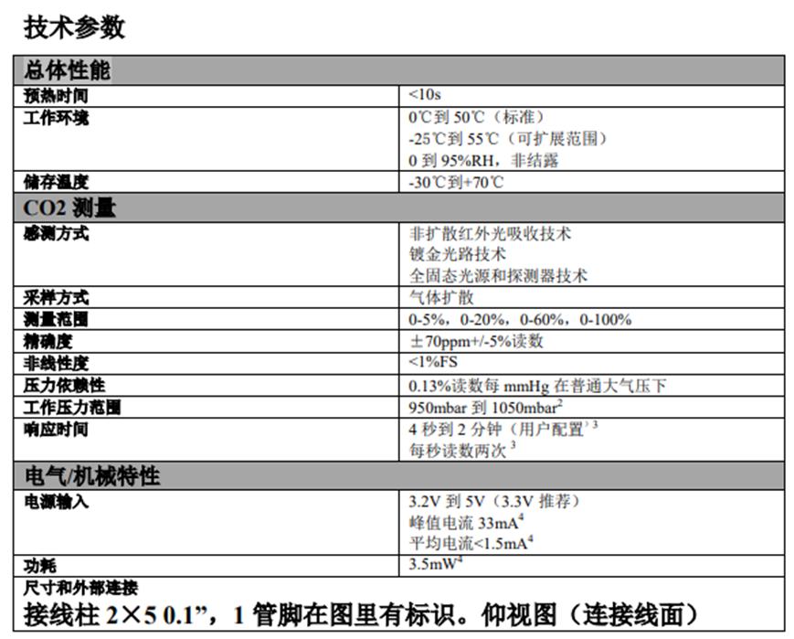 除了最基本的CO2濃度數(shù)字輸出外,該傳感器還可定制包含溫濕度輸出的數(shù)據(jù),以及模擬電壓輸出0.5-4V。