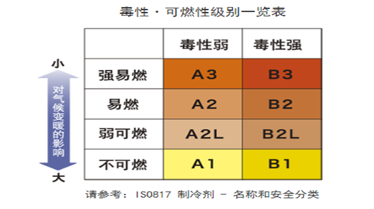 說到空調,目前,空調設備廣泛使用的制冷劑是化學性質穩定、不可燃(AI)的氟利昂,因此,即便是制冷劑泄露到空調設備外面,不必擔憂有起火等安全問題。然而,不可燃(AI)的氟利昂已經明確是引起氣候變暖的溫室效應氣體。大量泄漏逸散的話,會加劇溫室效應,導致地球更熱。