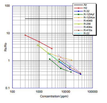 為此,FIGARO研發了一款檢測新式冷媒的傳感器TGS2630。它不僅對被廣泛應用于檢測空調、冷凍設備最常使用的制冷劑R-404a、R-410a,對可降低GWP(全球氣候變暖指數)的“弱可燃(A2L)制冷劑”R-32、R-1234yf以及“易燃(A3)制冷劑”R-290(主要成分為丙烷)等也有很高的靈敏度。
