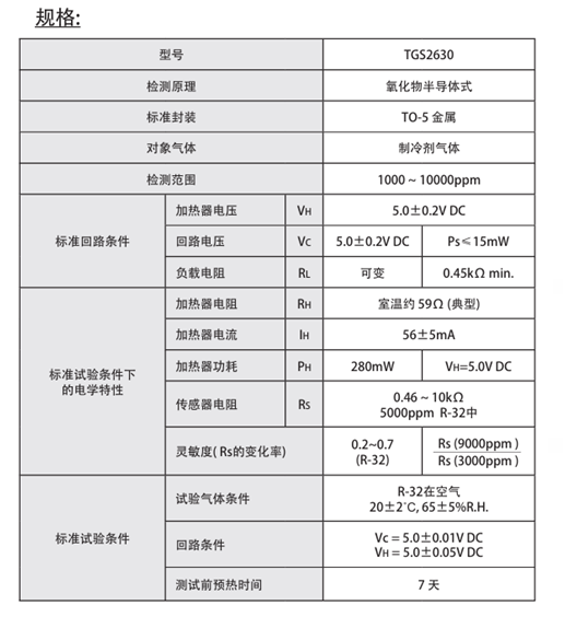 2. TGS2630(冷媒傳感器)具體規(guī)格: