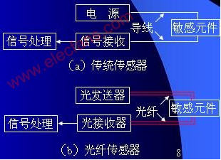以電為基礎(chǔ)的傳統(tǒng)傳感器是一種把測(cè)量的狀態(tài)轉(zhuǎn)變?yōu)榭蓽y(cè)的電信號(hào)的裝置。它的電源、信號(hào)接收、敏感元件和處理系統(tǒng)以及信息傳輸均用金屬導(dǎo)線連接,見圖(a)。光纖傳感器則是一種把被測(cè)量的狀態(tài)轉(zhuǎn)變?yōu)榭蓽y(cè)的光信號(hào)的裝置。由敏感元件、光發(fā)送器、信號(hào)處理系統(tǒng)、光接收器以及光纖構(gòu)成,見圖(b)。
