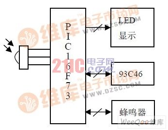 紅外發(fā)射部分電路框圖如圖1所示,主要由單片機PIC16F73及外部電路構(gòu)成。PIC16F73 單片機是由美國Microchip公司生產(chǎn)的8位單片機,采用Harvard結(jié)構(gòu),這種結(jié)構(gòu)使指令執(zhí)行和取指操作可重疊進行,從而達到很高的執(zhí)行速度。它只有35條單字節(jié)指令,除了跳轉(zhuǎn)指令是2周期指令外,其它指令都是單周期指令。相對于其它的8位單片機節(jié)省了1/2的程序空間,并具有四:1的速度優(yōu)勢。