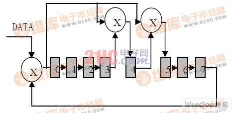 SHT75的CRC值生成算法是根據(jù)SHT75的硬件生成電路來模擬的,硬件生成電路結(jié)構(gòu)如圖四所示: