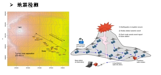 美國(guó)哈佛大學(xué)在去年部署了1套類似的應(yīng)急地震監(jiān)測(cè)系統(tǒng),主要部署在火山地區(qū)用來(lái)監(jiān)測(cè)因火山爆 發(fā)而導(dǎo)致的地震信息。系統(tǒng)采用TelosB無(wú)線傳感器節(jié)點(diǎn),搭載24位ADC用以監(jiān)測(cè)MEMS加速度計(jì)傳送的微弱振動(dòng)信息。節(jié)點(diǎn)以火山口為中心徑向部署, 間隔數(shù)百米部署1個(gè)節(jié)點(diǎn)。在部署完畢后可以監(jiān)測(cè)出地震沿徑向傳播各點(diǎn)的振動(dòng)信息。