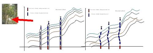 Crossbow和地理監(jiān)測(cè)專門人員進(jìn)行多次交流并進(jìn)行數(shù)次實(shí)地考察后,Crossbow幫助地質(zhì)專業(yè)公司Fugro和FT在HongKong大嶼山和青山地區(qū)部署了基于無(wú)線傳感器網(wǎng)絡(luò)的山體滑坡監(jiān)測(cè)方案。山體滑坡的監(jiān)測(cè)主要依靠?jī)煞N傳感器的作用,傾角傳感器和液位傳感器。在山體容易發(fā)生危險(xiǎn)的區(qū)域,將會(huì)沿著山勢(shì)走向豎直設(shè)置多個(gè)孔洞,如圖所示。
