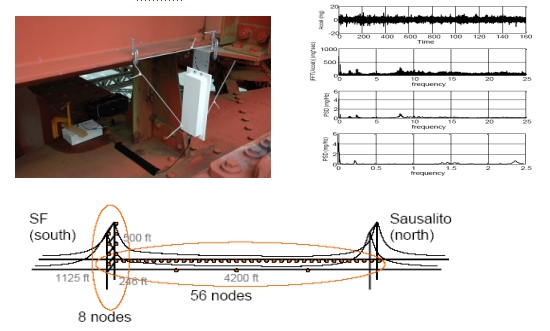 加速度計(jì)依然是監(jiān)測(cè)建筑物的簡(jiǎn)單有效的方式。美國(guó)加州大學(xué)伯克利分校在Cross-bow的 協(xié)助下對(duì)舊金山金門大橋部署過(guò)建筑健康監(jiān)測(cè)系統(tǒng)。其本意是用來(lái)檢測(cè)橋體在風(fēng)力作用下的各個(gè)關(guān)鍵受力點(diǎn)的振動(dòng)狀況,整體數(shù)據(jù)建模后就可以分析出橋體受損老化嚴(yán)重的部分,從而進(jìn)行有針對(duì)性的修補(bǔ)。