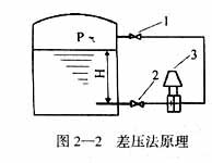差壓法:該方法的工作原理如圖2-2所示[4]。圖中,1、2-閥門;3-差壓變送器。對于開口容器或常壓容器,閥門1及氣相引壓管道可以省掉。壓力差與液位的關系為 ΔP=P2-P1=ρgH