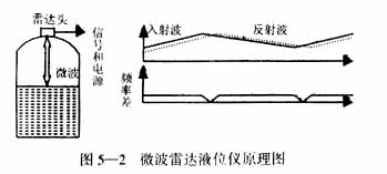 微波法:微波通過天線(大多為口徑天線,也有平面天線)輻射出去,經液面反射后被天線接收,然后由二次電路計算發射信號與接收信號的時間差得液位。連續波雷達液位儀原理如圖5—2所示,該液位儀采用三角波頻率調制形式,并通過對發射信號與接收信號混頻后得到的差額信號的分析,得到微波傳輸時間,從而計算出液位。微波速度受傳播介質、溫度、壓力、液體介電常數的影響很小,但液體界面的波動、液體表面的泡沫、液體介質的介電常數對微波反射信號強弱有很大影響。當壓力超過規定數值時,壓力對液位測量精度將產生顯著影響。對于介電常數小于規定數值的液體,大部分雷達液位儀都需要采用波導管,但波導管的銹蝕、彎曲和傾斜都會影響測量精度。例如:當空高h為20 m,導波管與垂直方向傾斜角度α只要超過0.573°,則引起的液位誤差Δh將超過1 mm,由此證明,在傾斜角度α(單位為度)較小時,Δh滿足:![]()