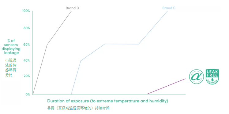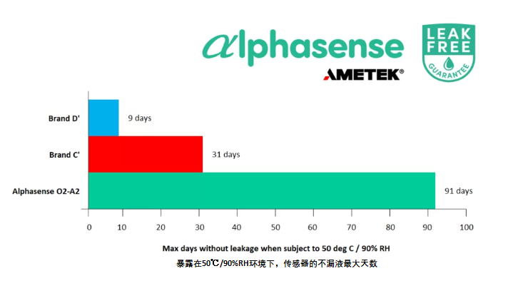 競爭對手的傳感器最終失效, Alphasense 85%的傳感器仍然沒有漏液。